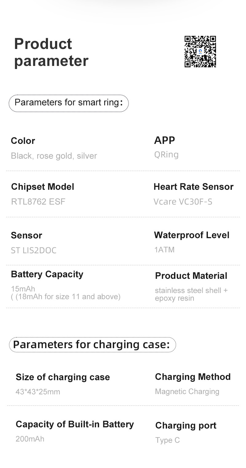 Product includes: Smart ring * 1Charging compartment*1USB data cable * 2Packing box * 1